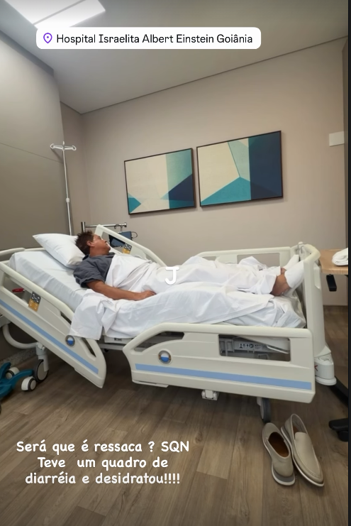 Poliana postou uma foto do cantor no hospital e escreveu: "Será que é ressaca? SQN. Teve um quadro de diarreia e desidratou!!!!", contou.