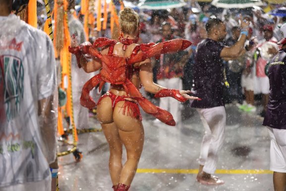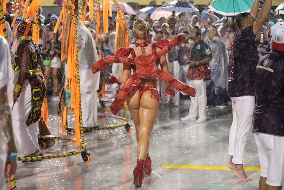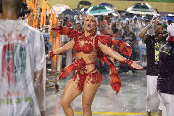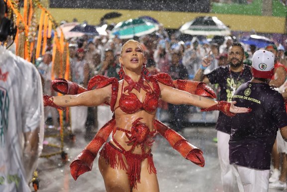 Virginia Fonseca roubou a cena em ensaio técnico da Grande Rio na Marquês de Sapucaí, realizado na noite do último domingo (8), embaixo de forte chuva. Rainha de bateria da escola, ela mostrou sampa no pé e muita disposição.